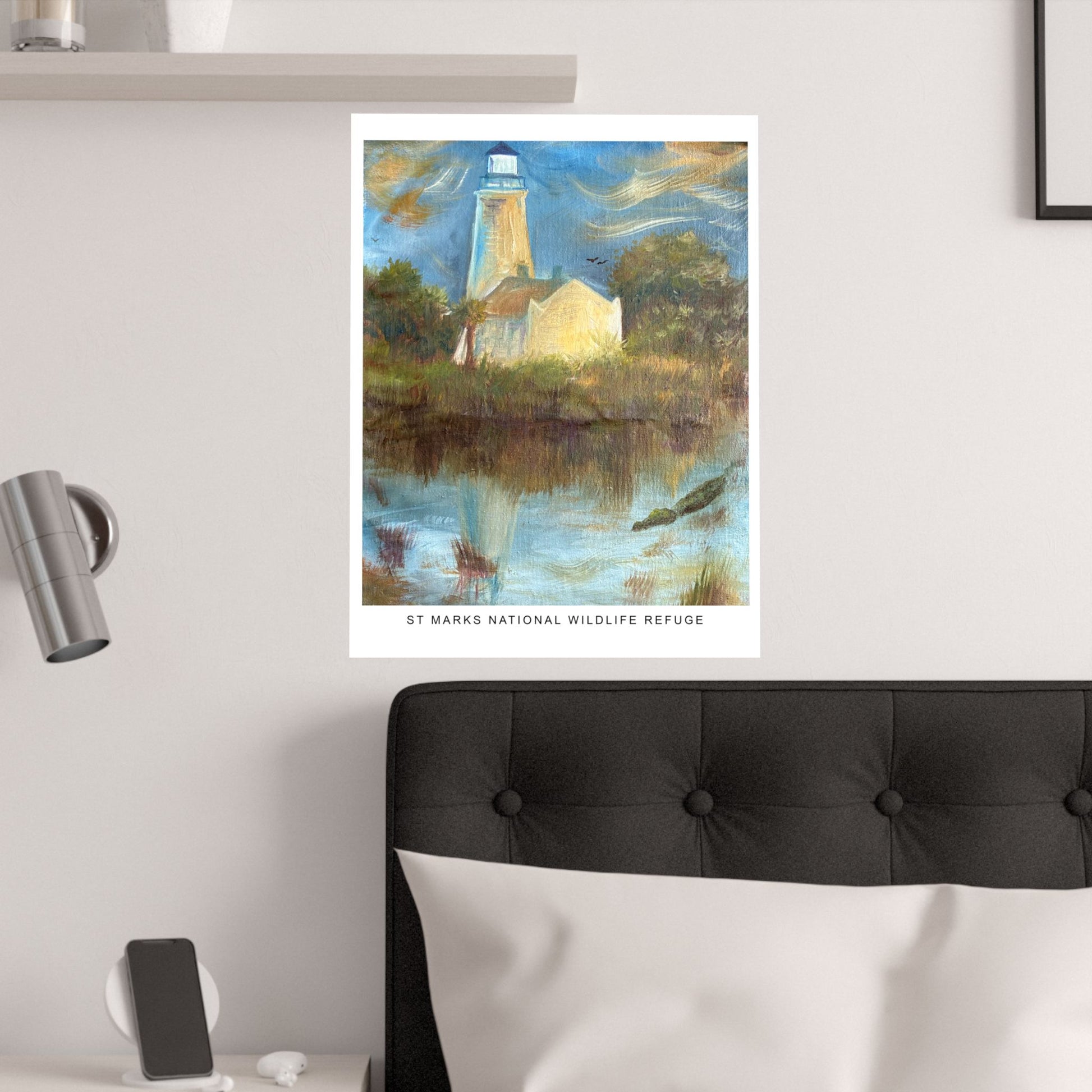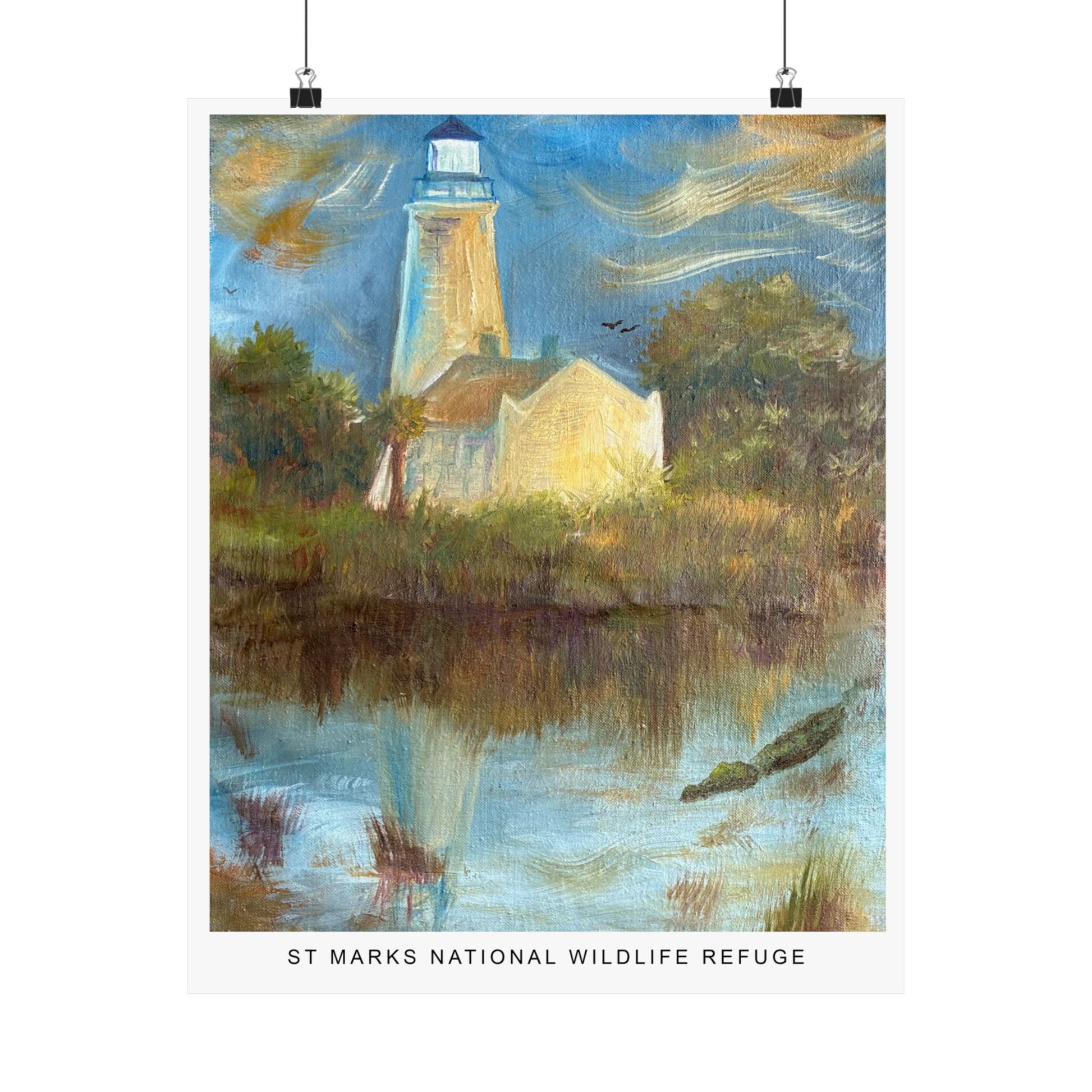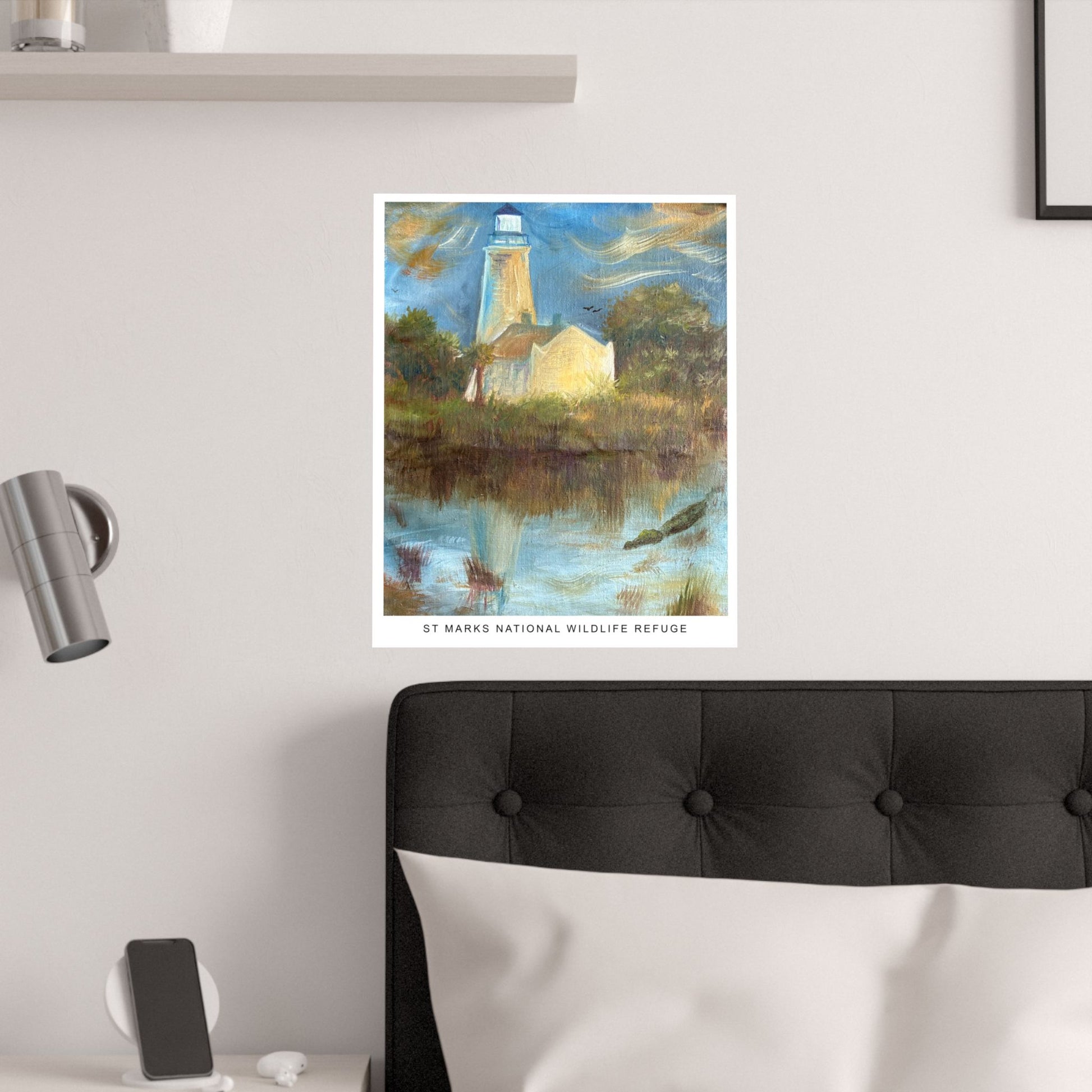 Immerse yourself in the tranquil blues and lush greens of Florida’s wild heart with our St Marks National Wildlife Refuge Fine Art Print. Featuring a vivid, high-quality print of an original painting of the St Marks Lighthouse and surrounding wildlife, this print captures the natural beauty of Florida’s Gulf Coast - from graceful birds in flight to lounging alligators and marsh grasses swaying in the breeze — this print brings the serenity and wonder of the wetlands to your home.