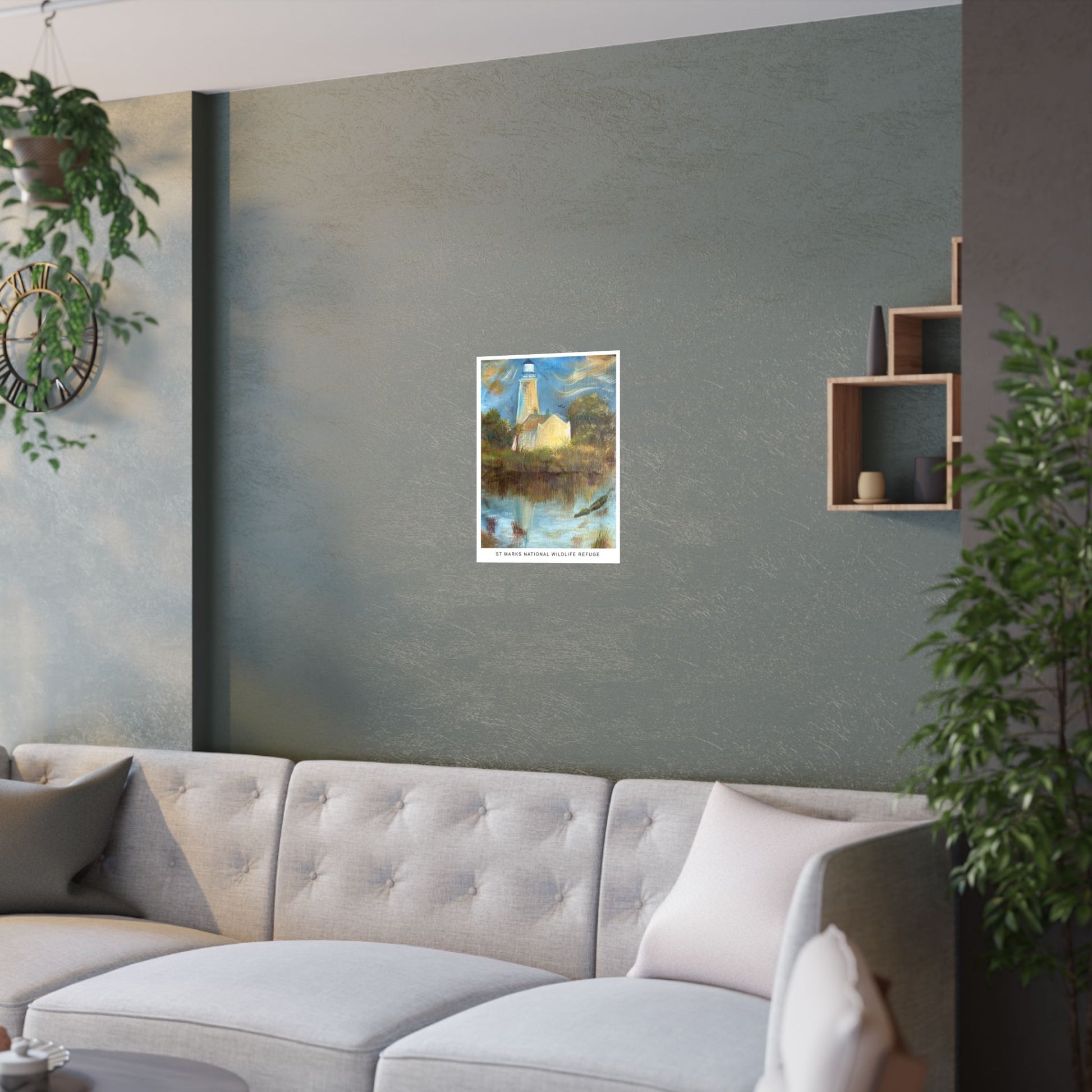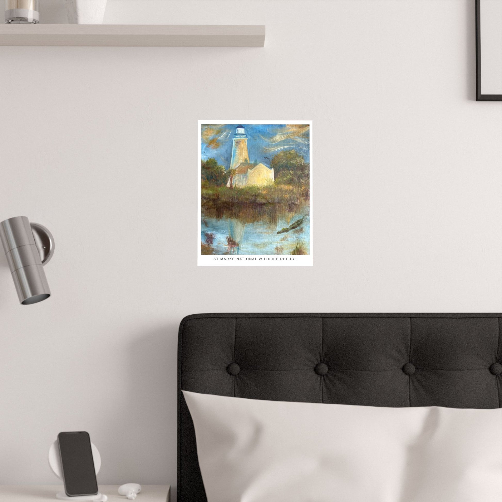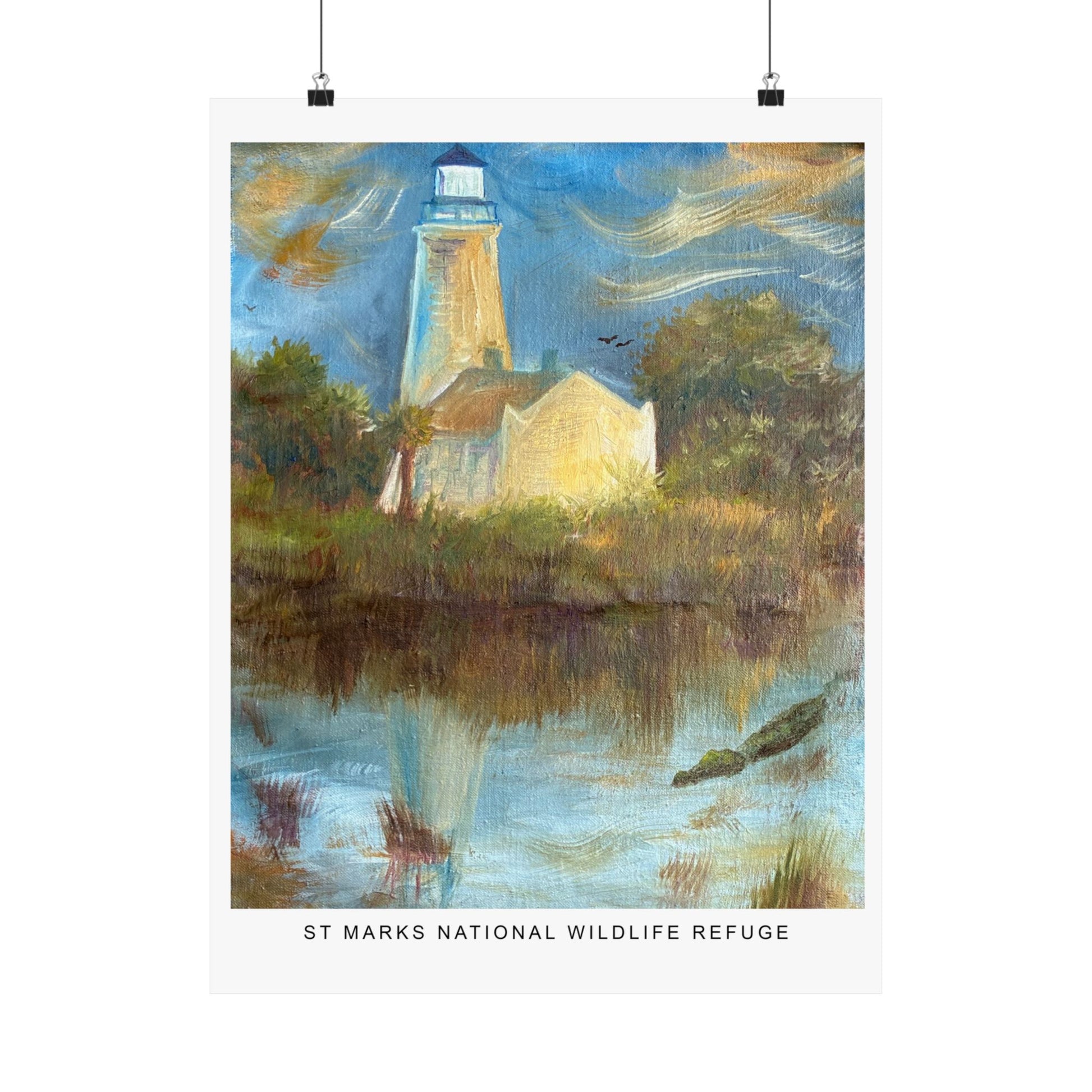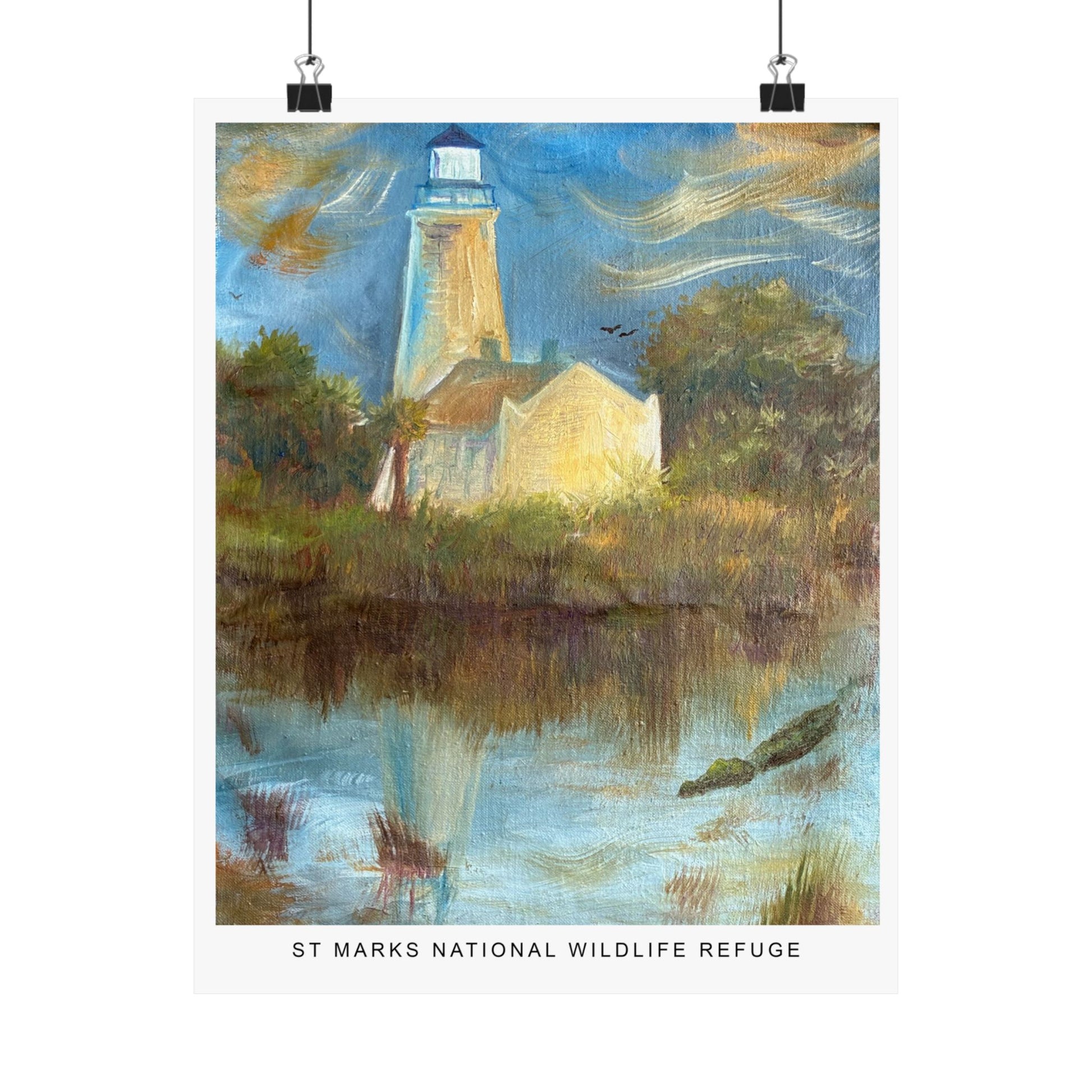Immerse yourself in the tranquil blues and lush greens of Florida’s wild heart with our St Marks National Wildlife Refuge Fine Art Print. Featuring a vivid, high-quality print of an original painting of the St Marks Lighthouse and surrounding wildlife, this print captures the natural beauty of Florida’s Gulf Coast - from graceful birds in flight to lounging alligators and marsh grasses swaying in the breeze — this print brings the serenity and wonder of the wetlands to your home.