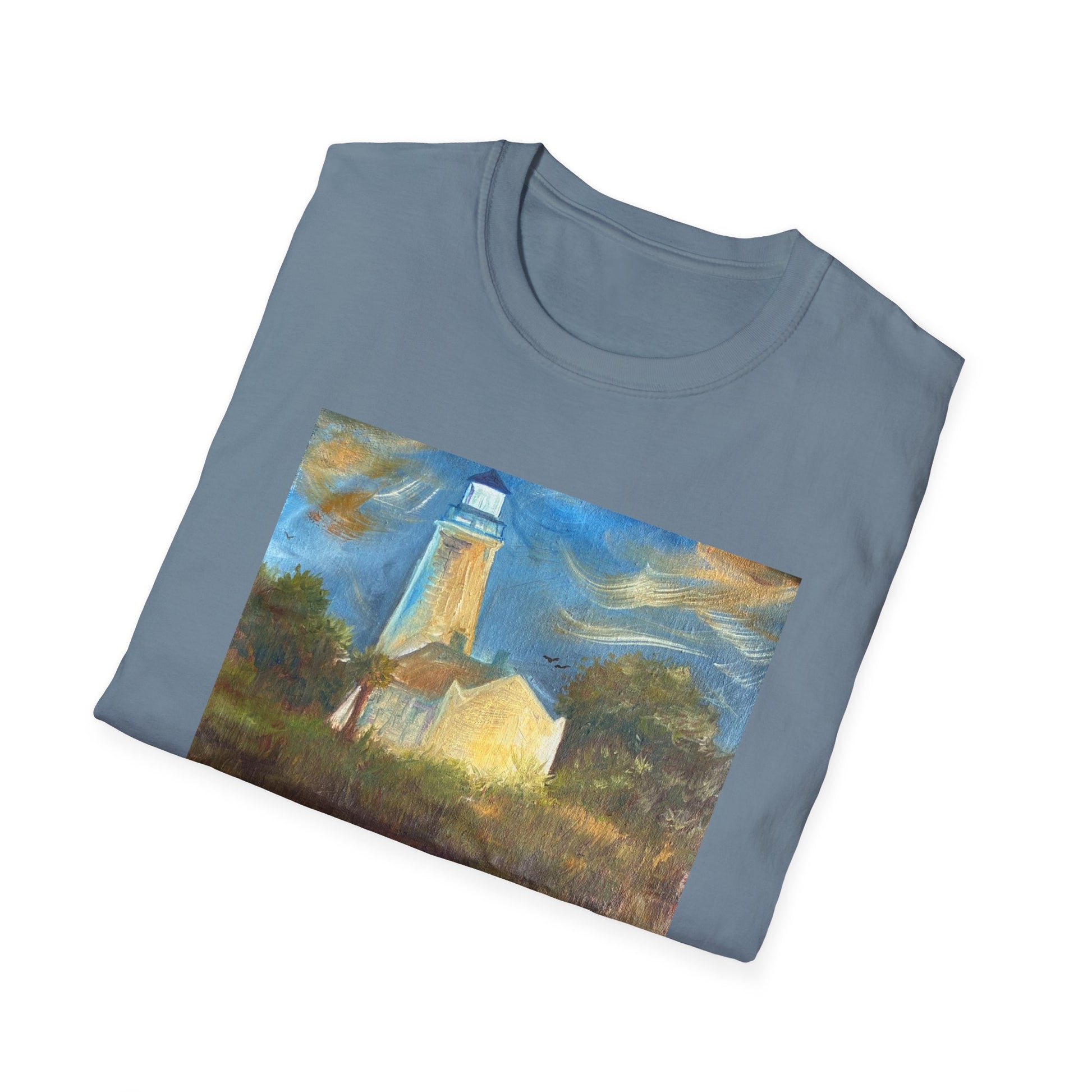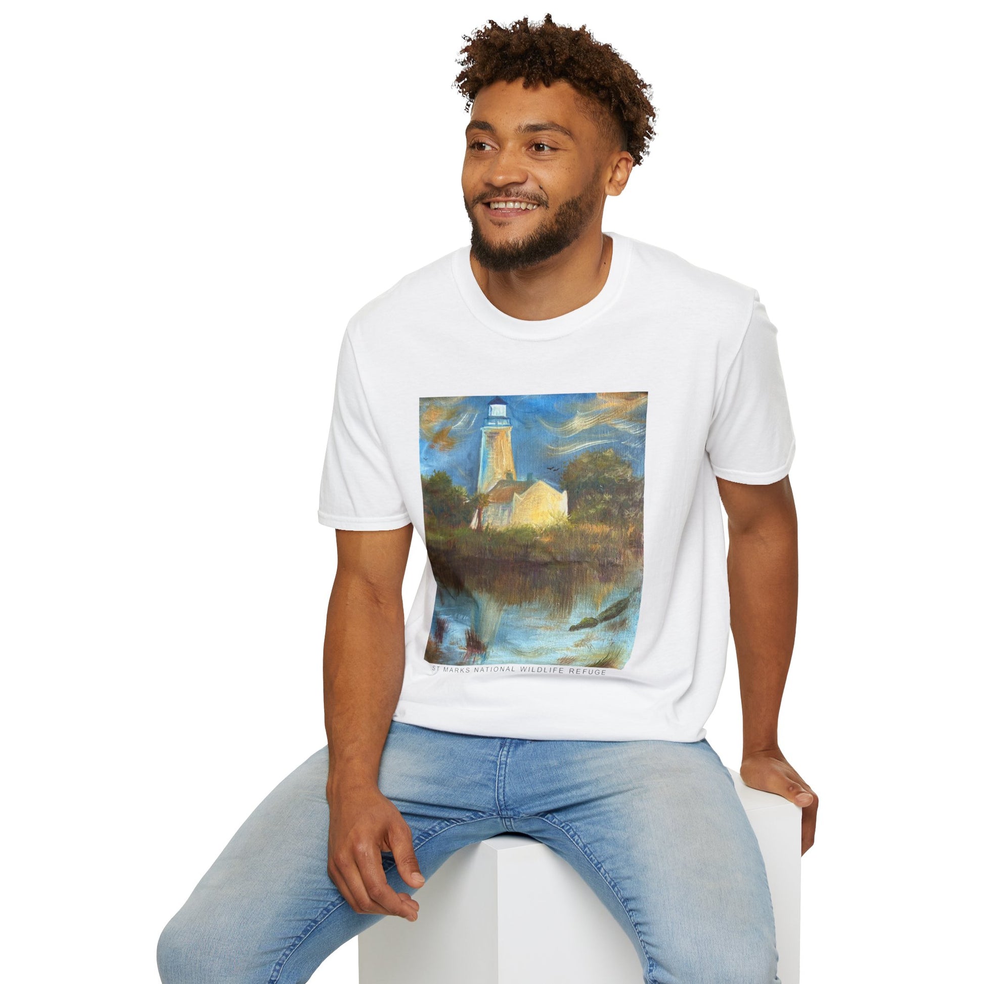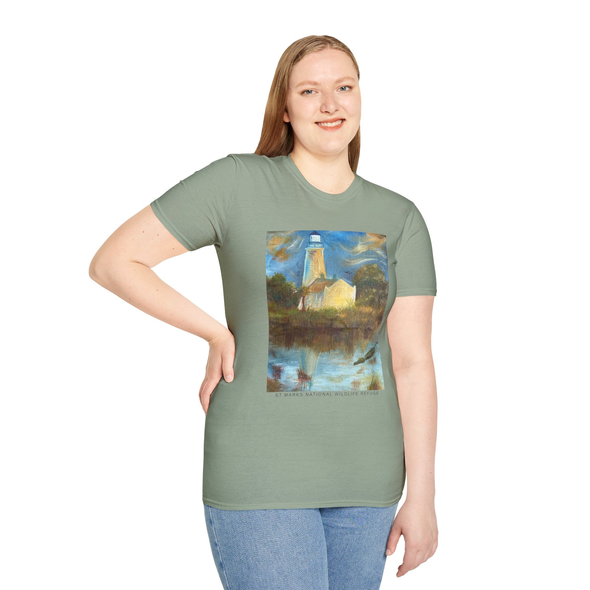 Immerse yourself in the tranquil blues and lush greens of Florida’s wild heart with our St Marks National Wildlife Refuge Unisex Softstyle T-Shirt. Featuring a vivid, high-quality print of an original painting of the St Marks Lighthouse and surrounding wildlife, this shirt captures the the natural beauty of Florida’s Gulf Coast - from graceful birds in flight to lounging alligators and marsh grasses swaying in the breeze — this shirt brings the serenity and wonder of the wetlands to your wardrobe.