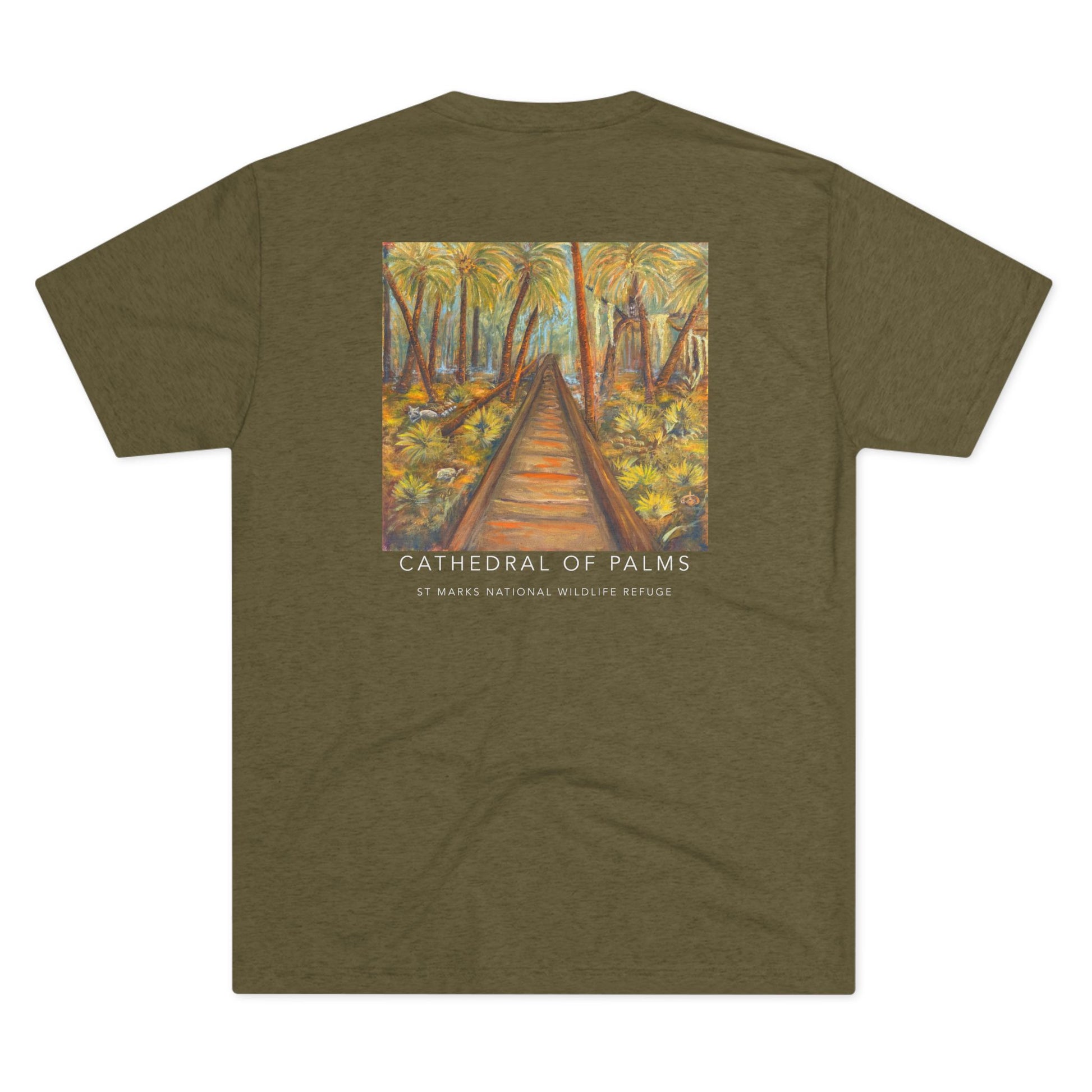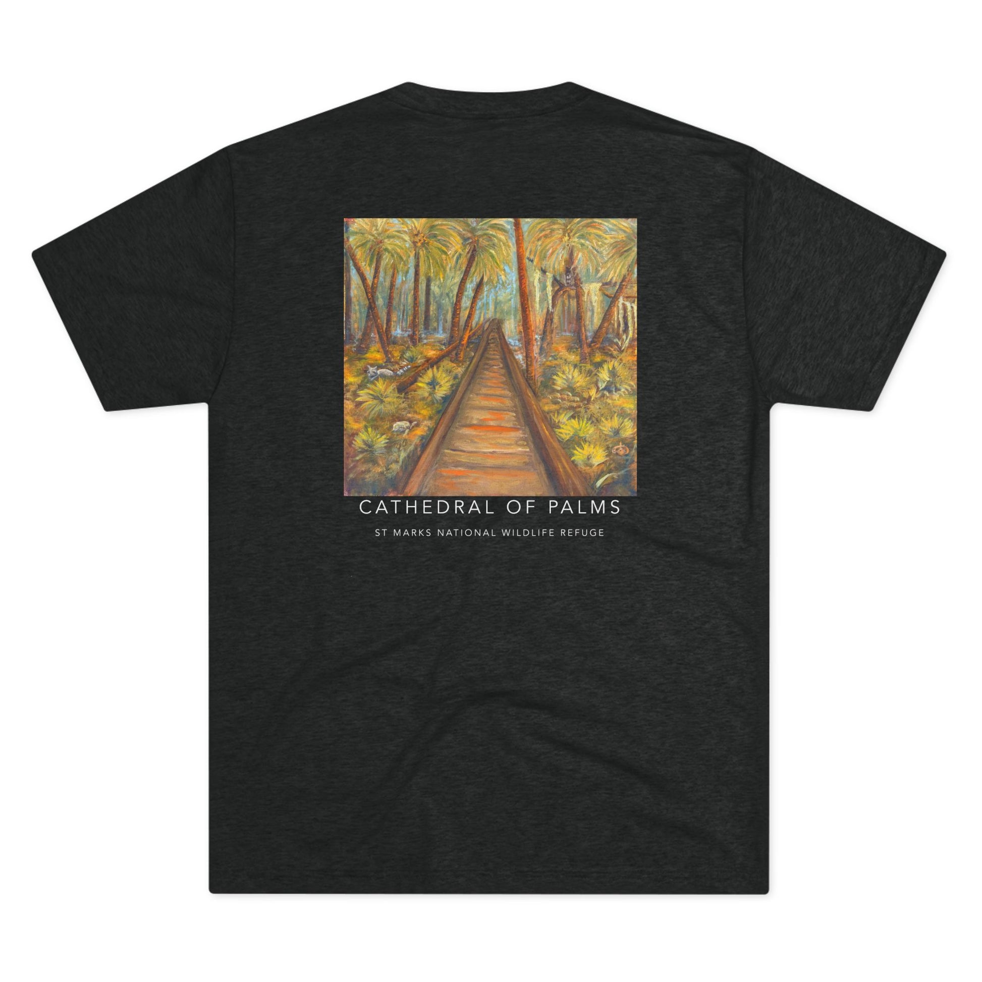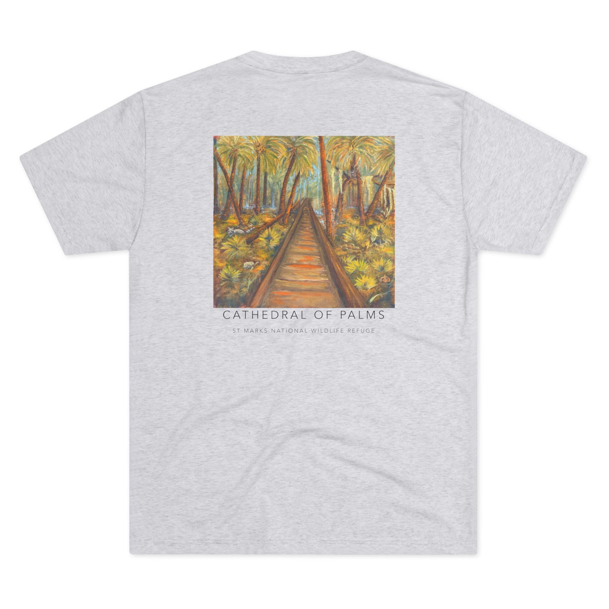 Immerse yourself in the tranquil blues and lush greens of Florida’s wild heart with our Cathedral of Palms Tri-Blend Unisex Shirt. Step into the serene beauty of Florida’s coast with this shirt, adorned with a vivid print of an original oil painting of the Cathedral of Palms at St. Marks National Wildlife Refuge. Known for its breathtaking canopy of towering sabal palms that arch overhead like the vaulted ceilings of a cathedral, this natural wonder creates a peaceful, awe-inspiring pathway beloved by hikers, birdwatchers, and artists alike.