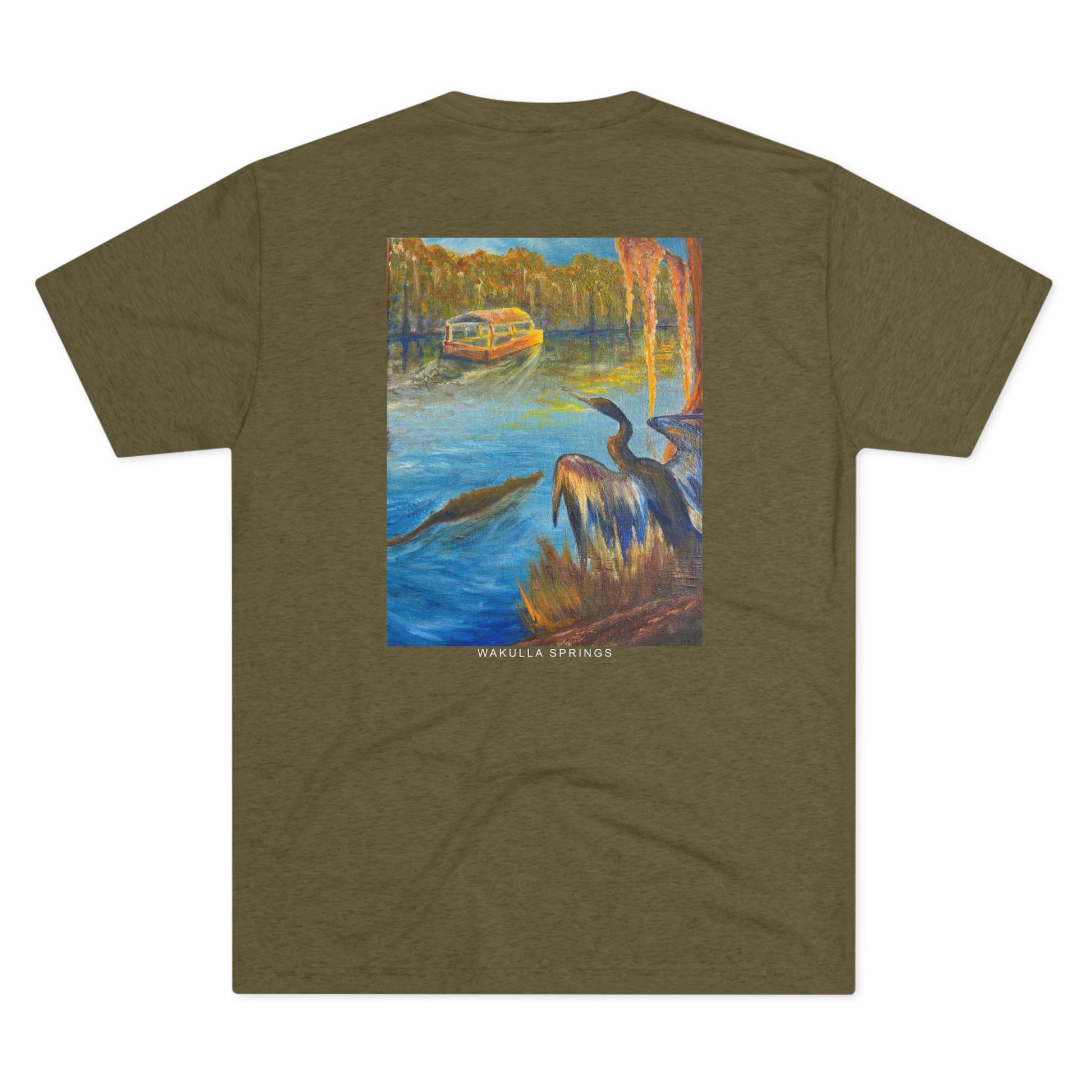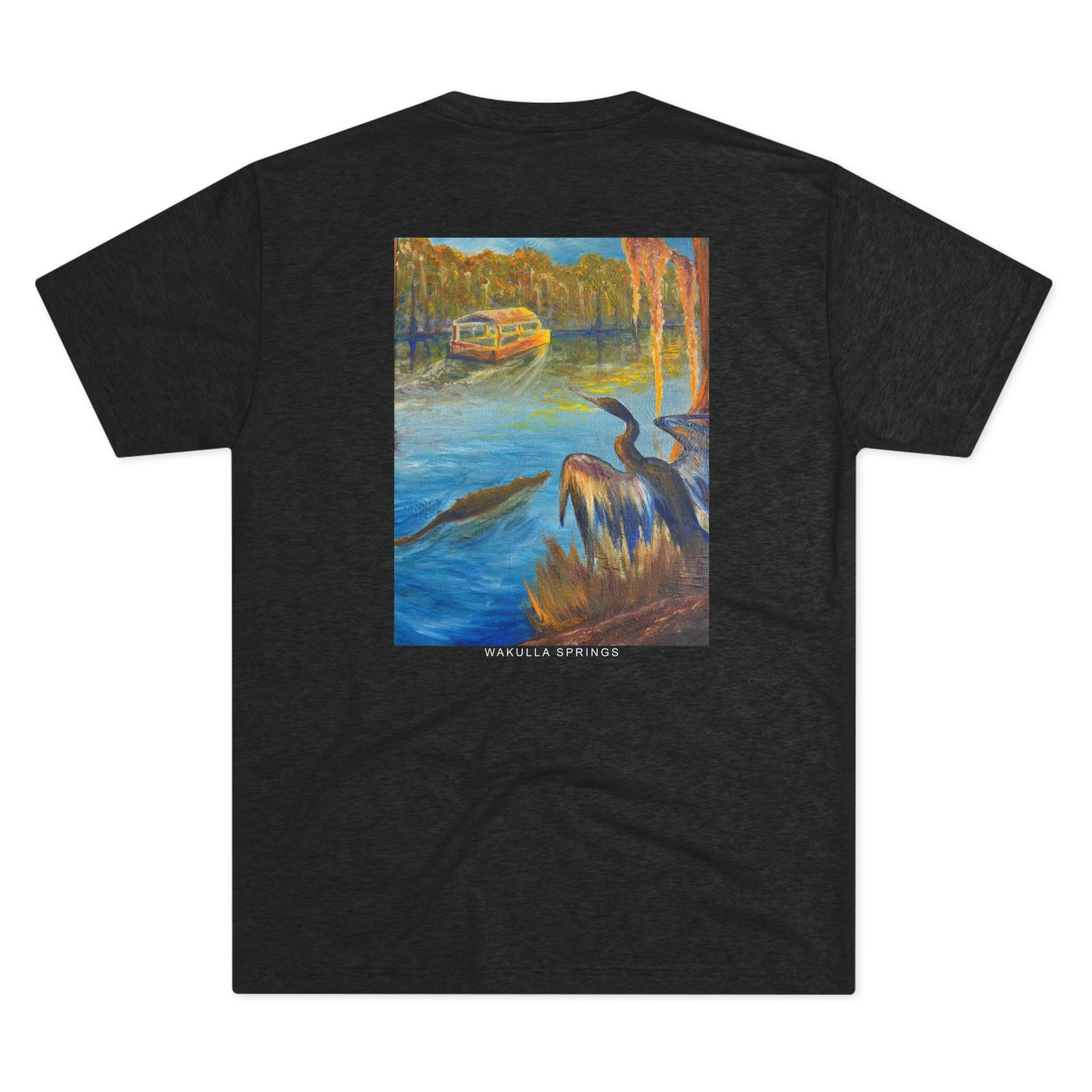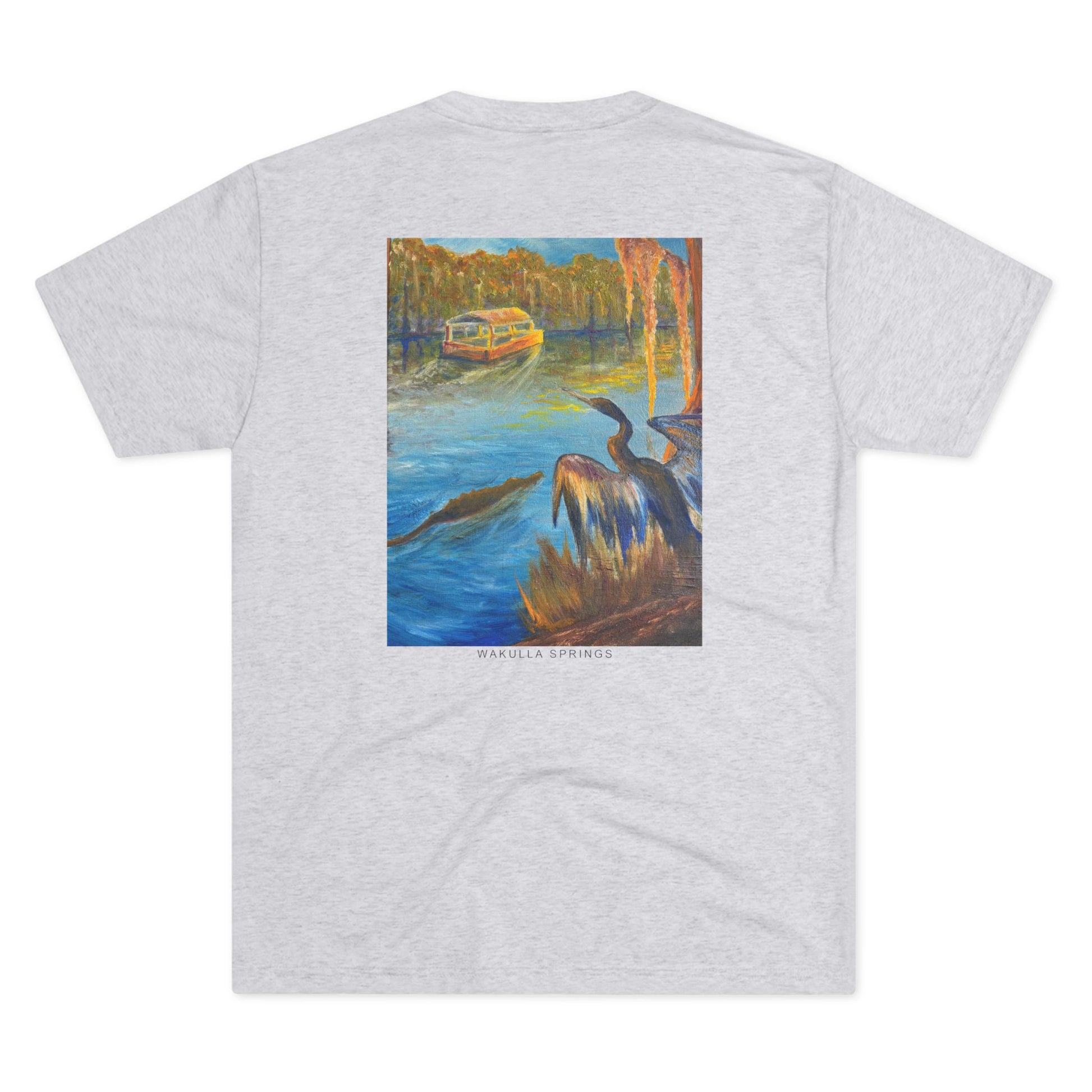 Immerse yourself in the tranquil blues and lush greens of Florida’s wild heart with our Wakulla Springs Anhinga Tri Blend Unisex T-Shirt. Featuring a vivid, high-quality print of an original painting of Wakulla Springs, this shirt captures the mesmerizing waters, an anhinga, the famous Wakulla Springs boat tour, and untamed beauty of one of the state's most breathtaking natural springs.